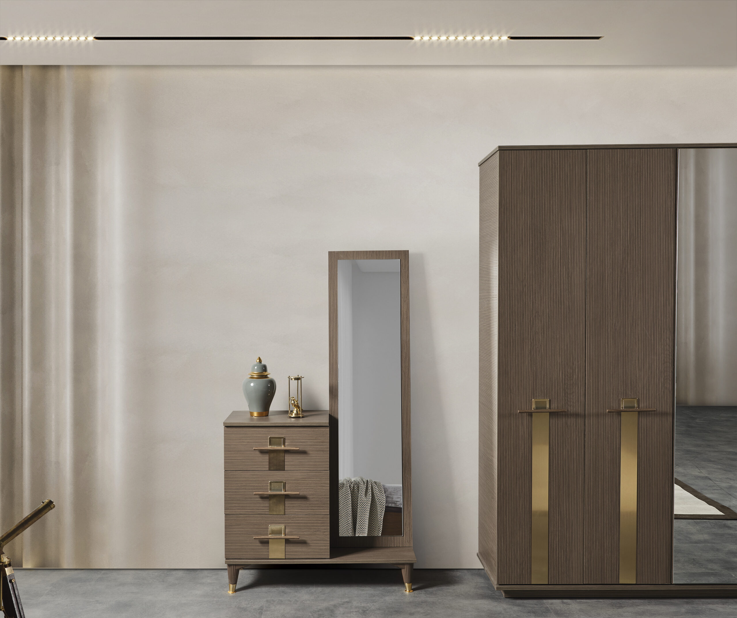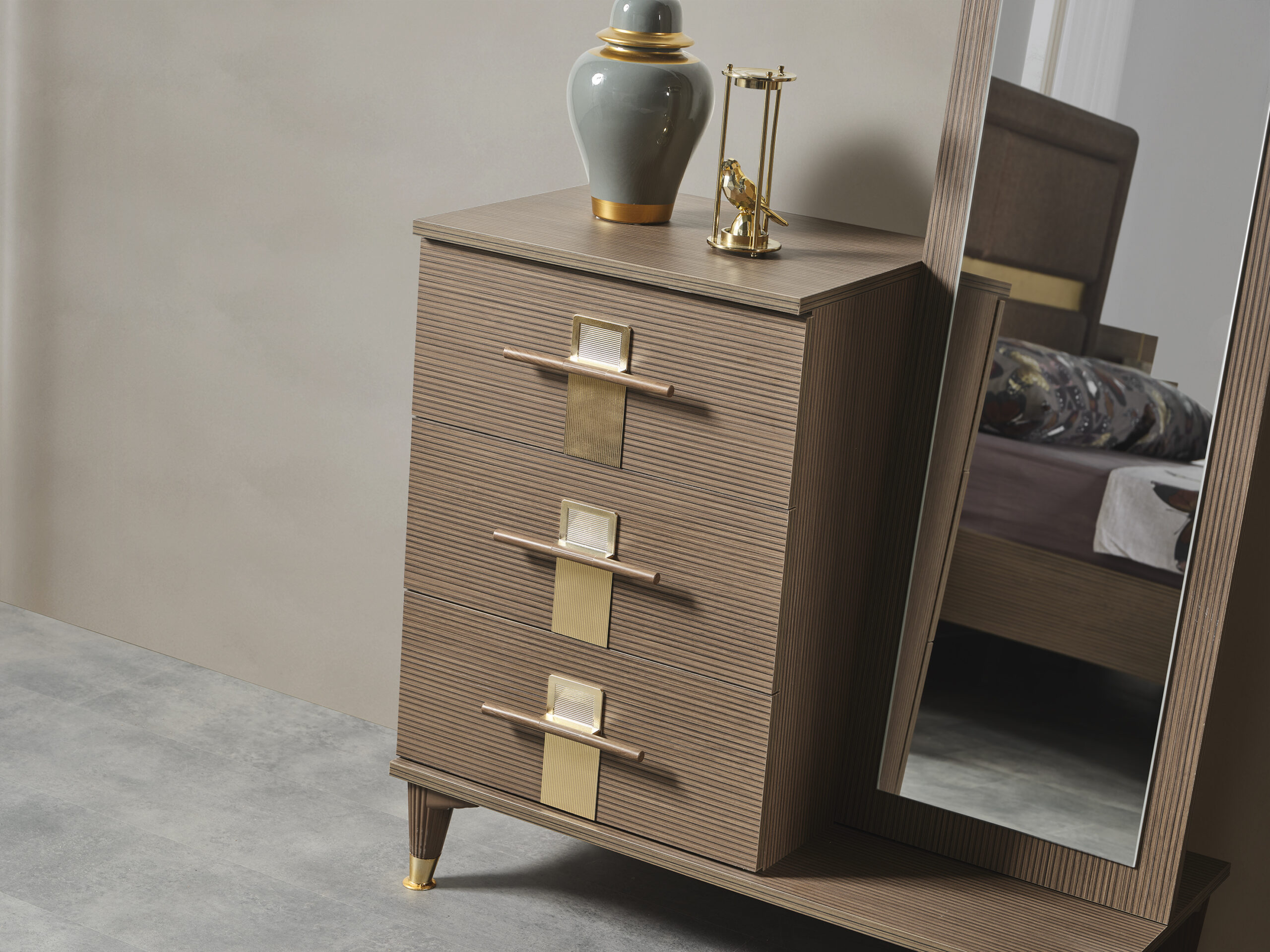 | TAKIM İÇERİĞİ | Bir gardırop,bir şifonyer,bir karyola,bir başlık ve iki komodin den oluşmaktadır. |