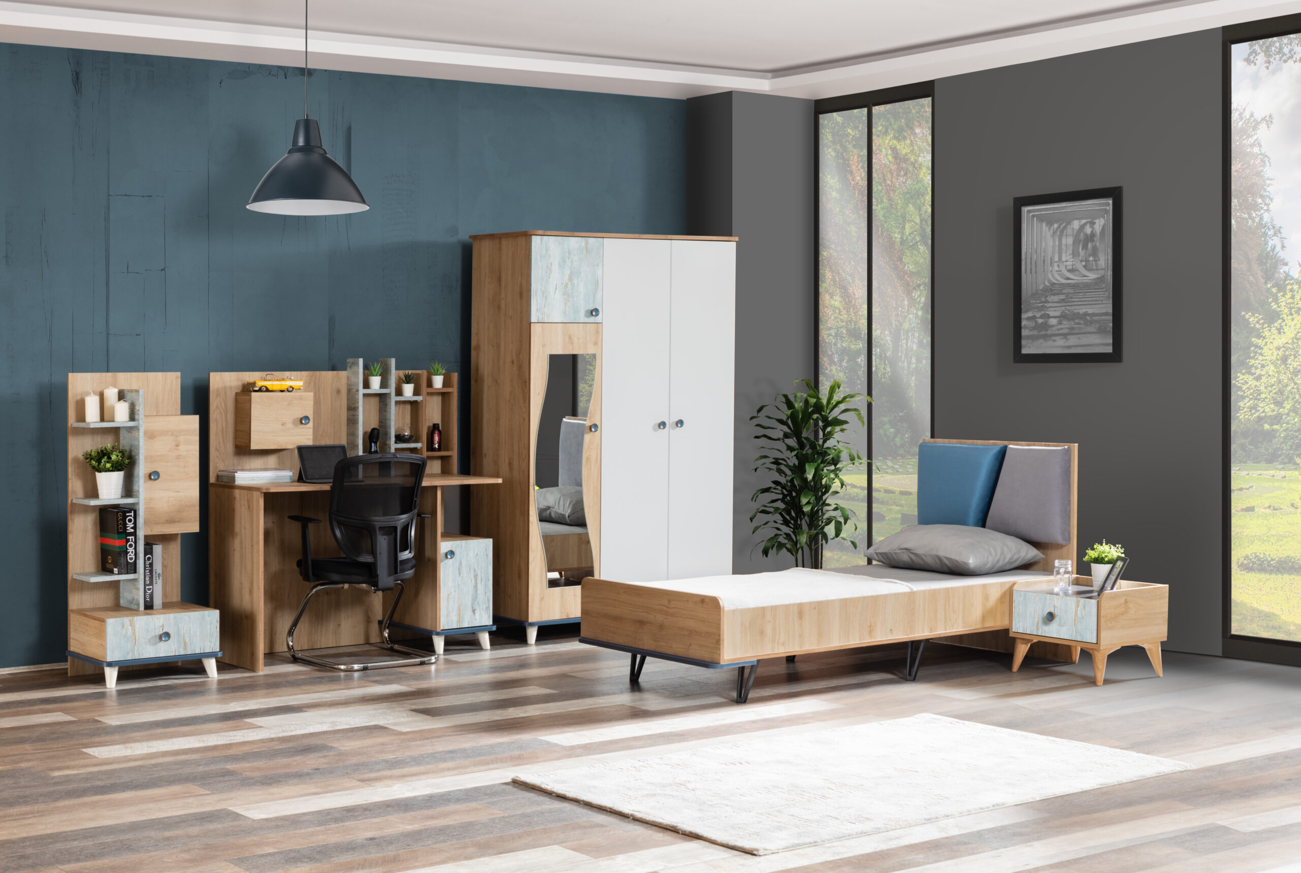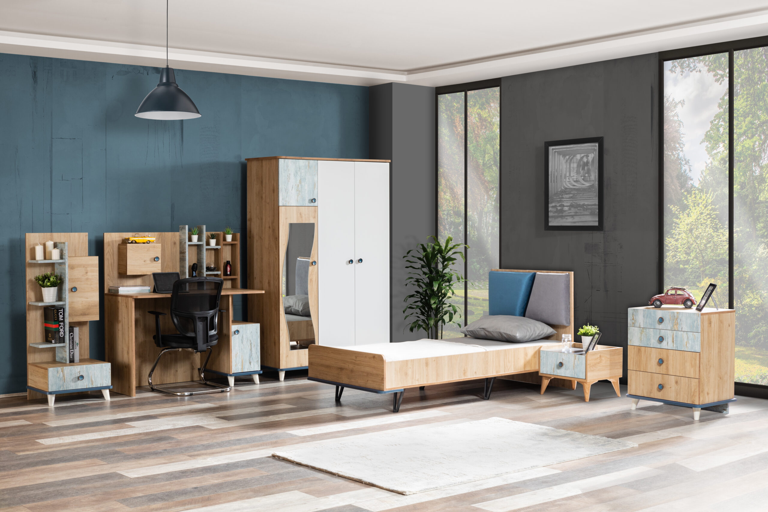| TAKIM İÇERİĞİ | Bir gardırop, bir çamaşırlık, bir çalışma masası, bir kitaplık, bir somyalı karyola, bir komodin`den oluşmaktadır. |
